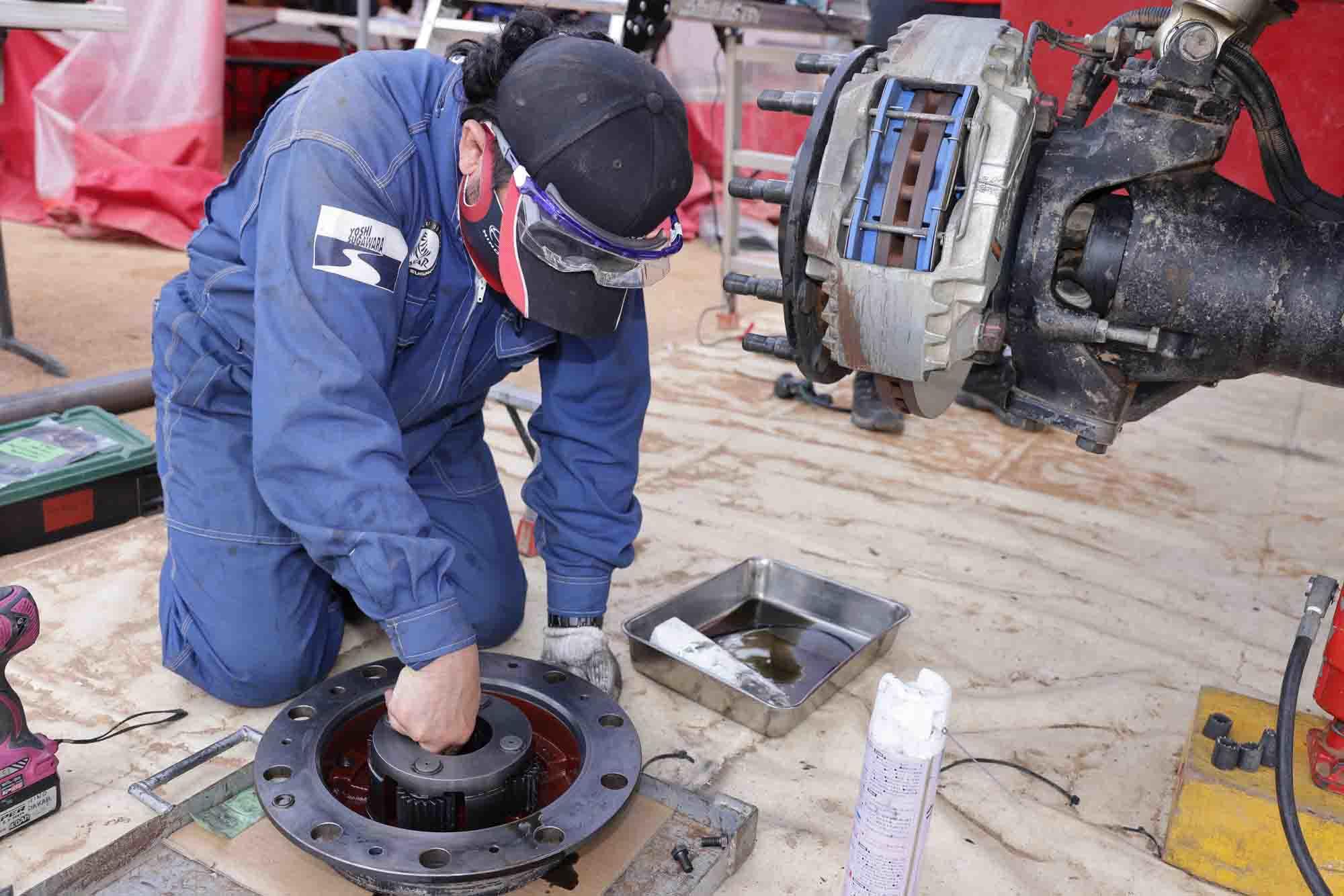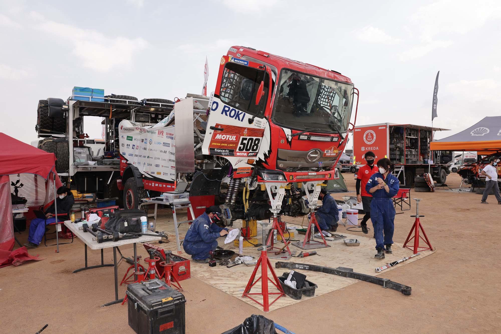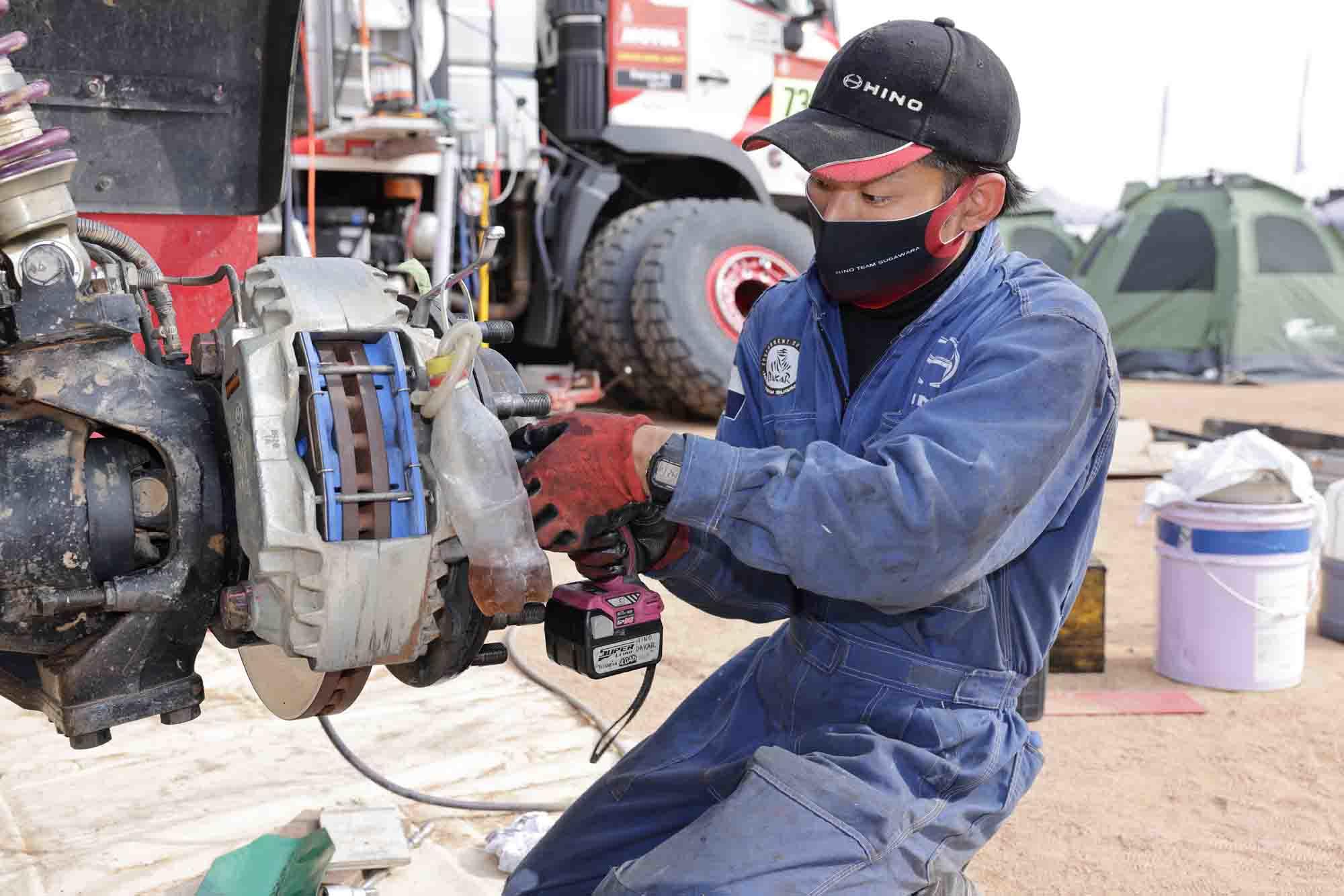 HINO TEAM SUGAWARA inspects and services their truck at the bivouac in Ha’il
